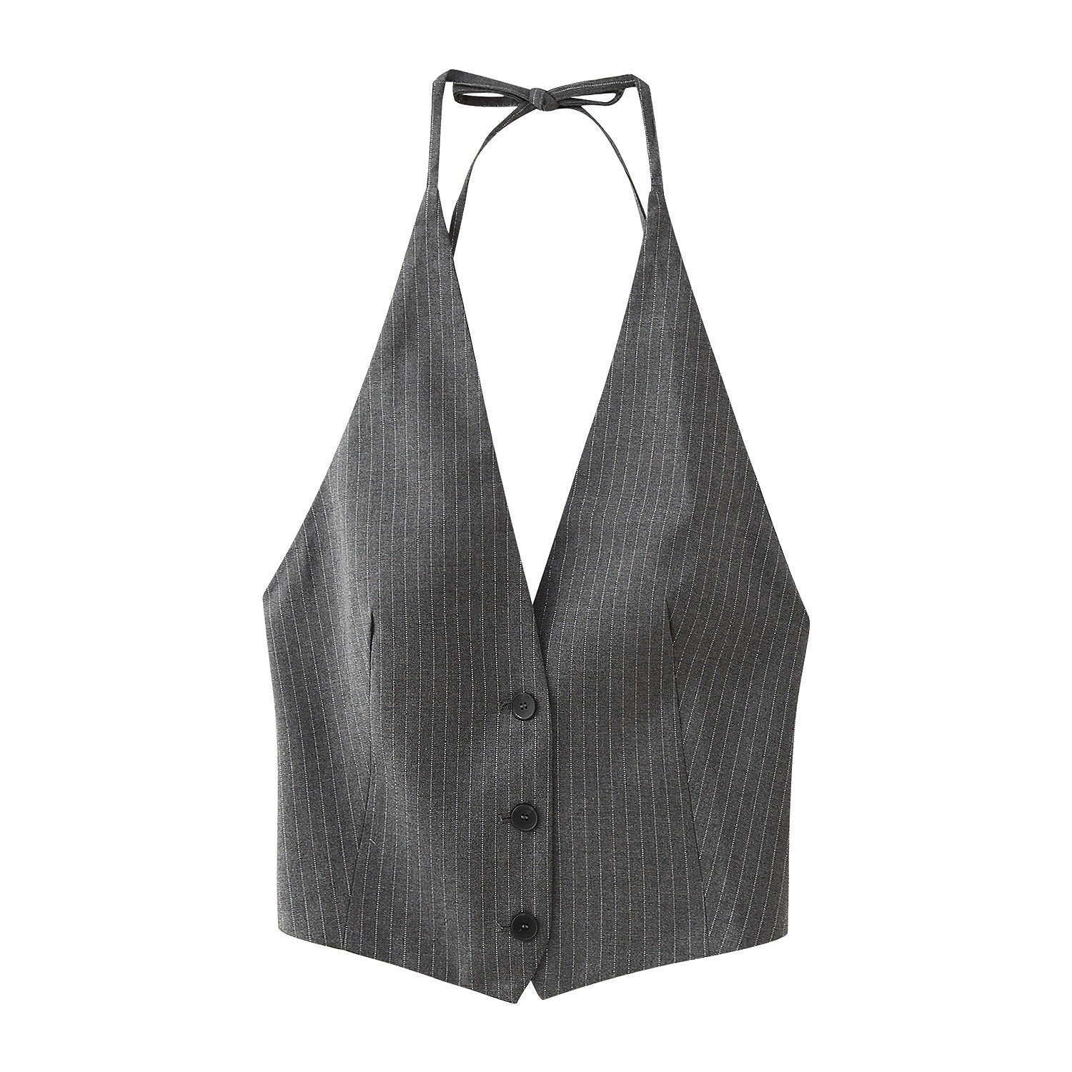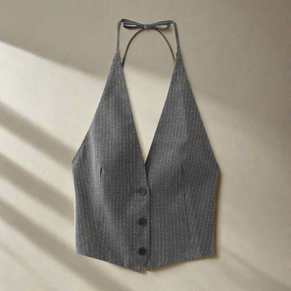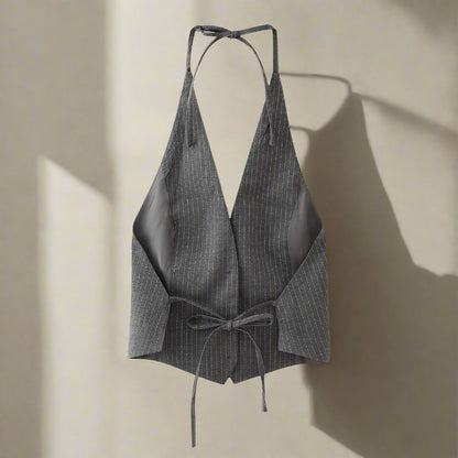 Das Alva ärmellose Top kombiniert das klassische Nadelstreifenmuster mit einem modernen Rückenausschnitt und sorgt so für einen eleganten und zugleich verführerischen Look. Der V-Ausschnitt betont die Silhouette und macht es zur idealen Wahl für formelle Anlässe oder einen stilvollen Abend. Dieses Design bringt zeitlose Eleganz in Ihre Garderobe.