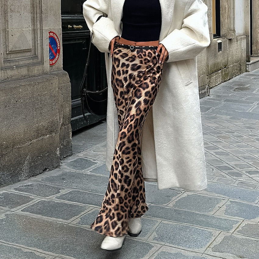 Mit Alva bringen Sie aufregende Eleganz in Ihr Outfit. Dieser Rock kombiniert fließendes Satinmaterial mit einem markanten Leopardenmuster, das Sie sofort ins Rampenlicht rückt. Der feminine Fischschwanz-Schnitt betont Ihre Figur und sorgt für einen glamourösen Auftritt.