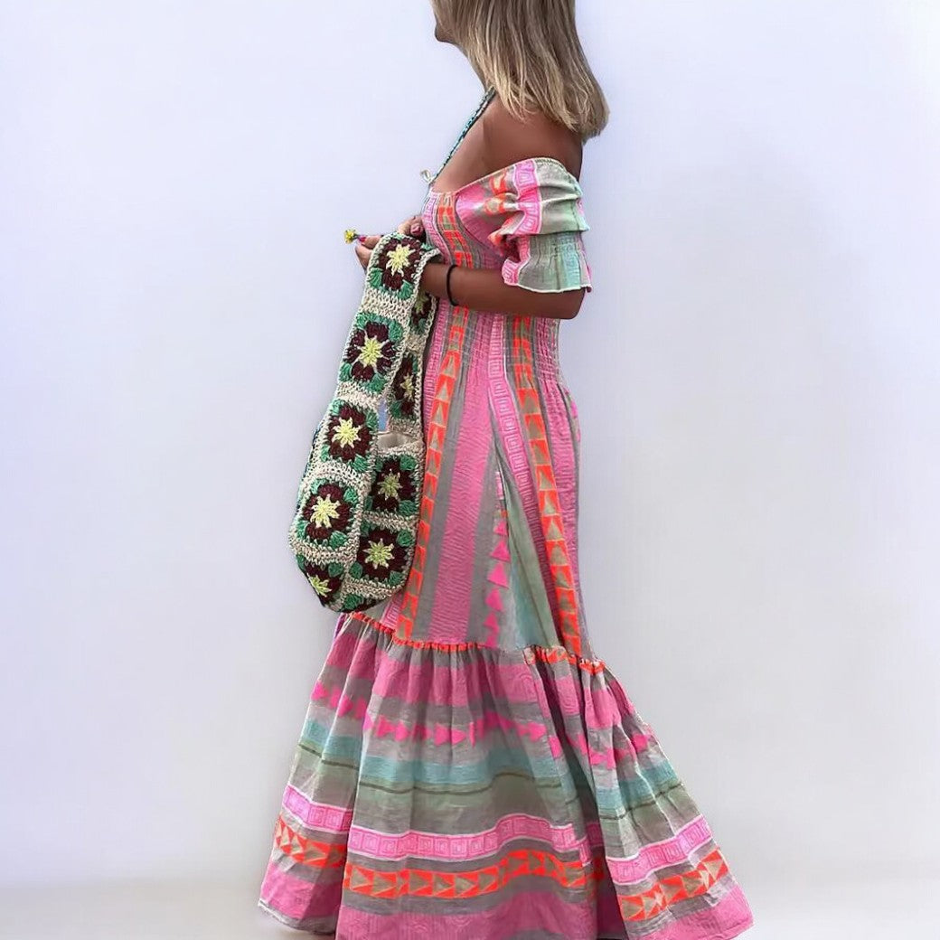 Blickfang: Das Maxikleid Anya besticht durch seinen auffälligen geometrischen Drucken, der garantiert alle Blicke auf sich zieht und einen modischen Akzent setzt.