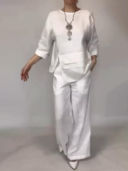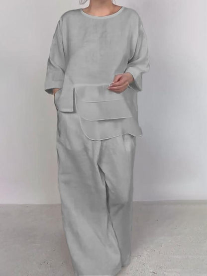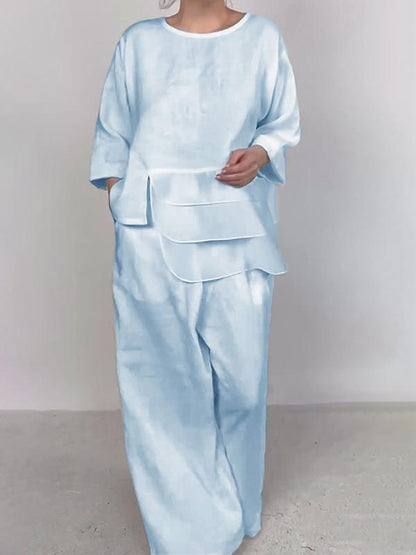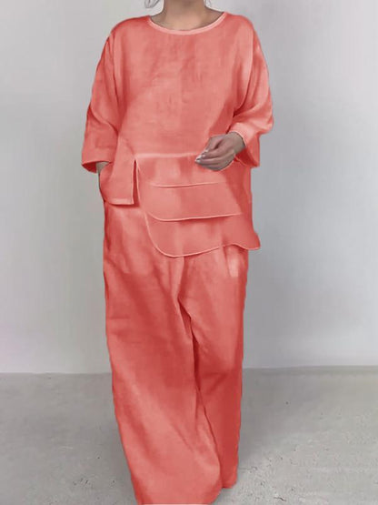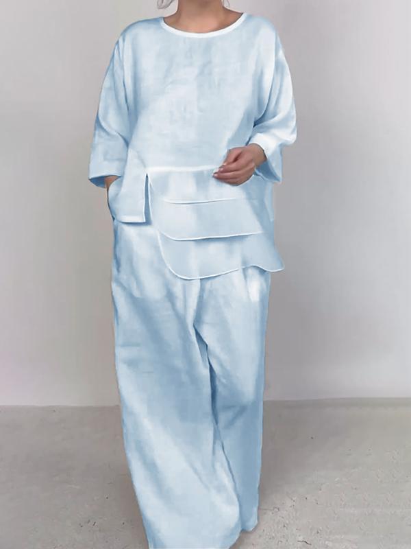 Voel je elegant en verfijnd met deze **satijnen set**. Het zachte, glanzende materiaal en het **elegante ontwerp** maken dit de perfecte outfit voor speciale gelegenheden. De **crew neck** en **3/4 mouwen** zorgen voor een tijdloze look.