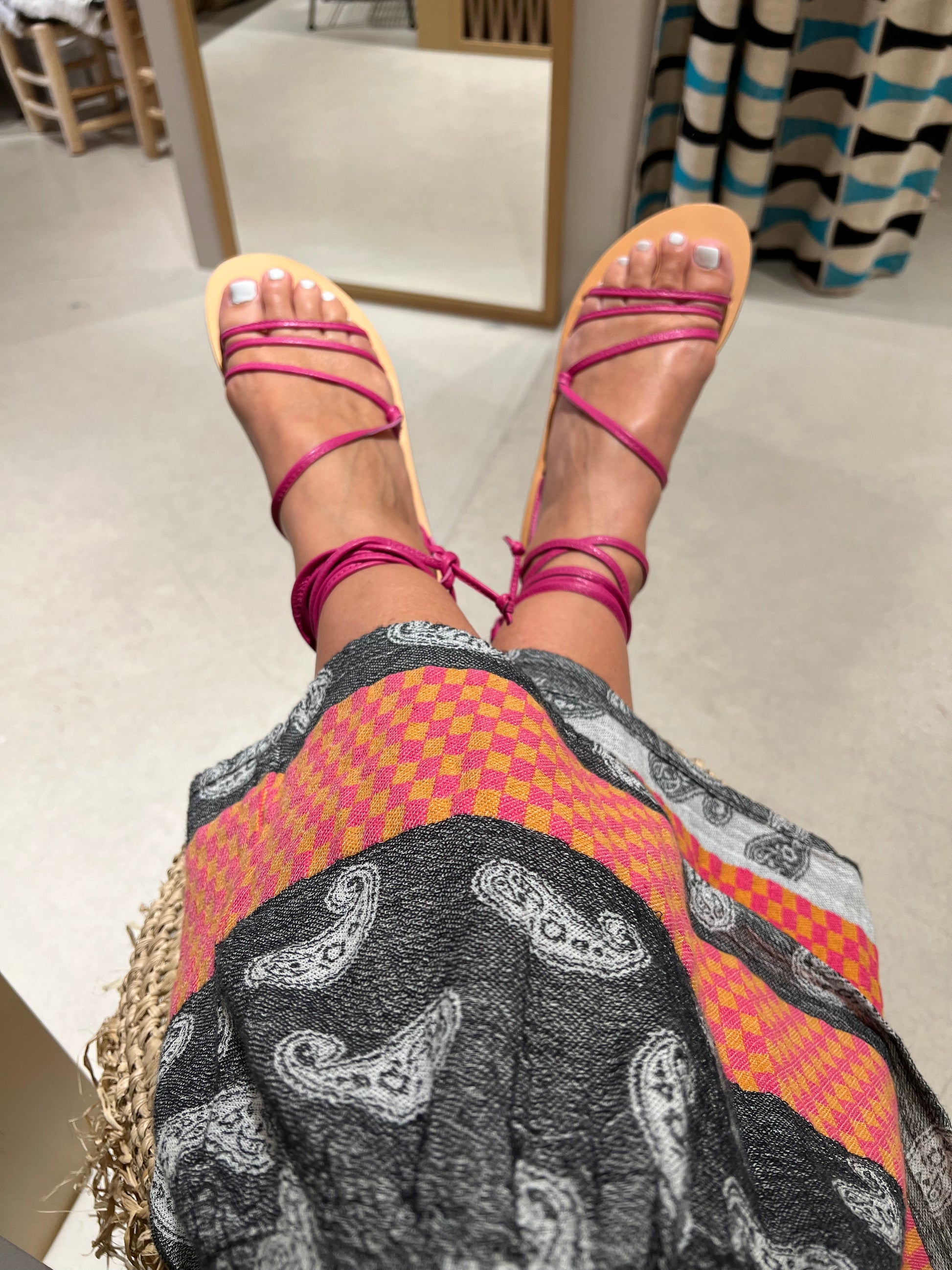 Knallig pinke Gladiator Sandale mit filigranen Riemen. Tolle Passform am Fuss und bequem zu tragen, trotz der dünnen Riemen.