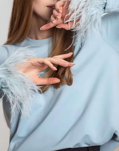 Der Sofia-Pullover für Damen besticht durch seinen eleganten Schnitt und das einzigartige Feder-Design am Handgelenk. Er ist aus weichem Material gefertigt und bietet einen angenehmen Tragekomfort. Mit seinem modernen Design ist dieser Pullover ein echter Hingucker.