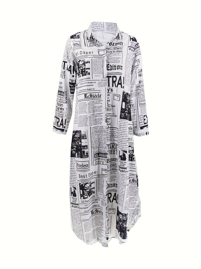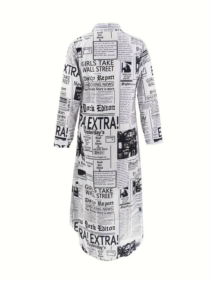 Wir stellen Ihnen das Hemdblusenkleid von Violett mit Zeitungsdruck vor – ein trendiges und einzigartiges Stück, das perfekt ist, um ein Statement zu setzen.